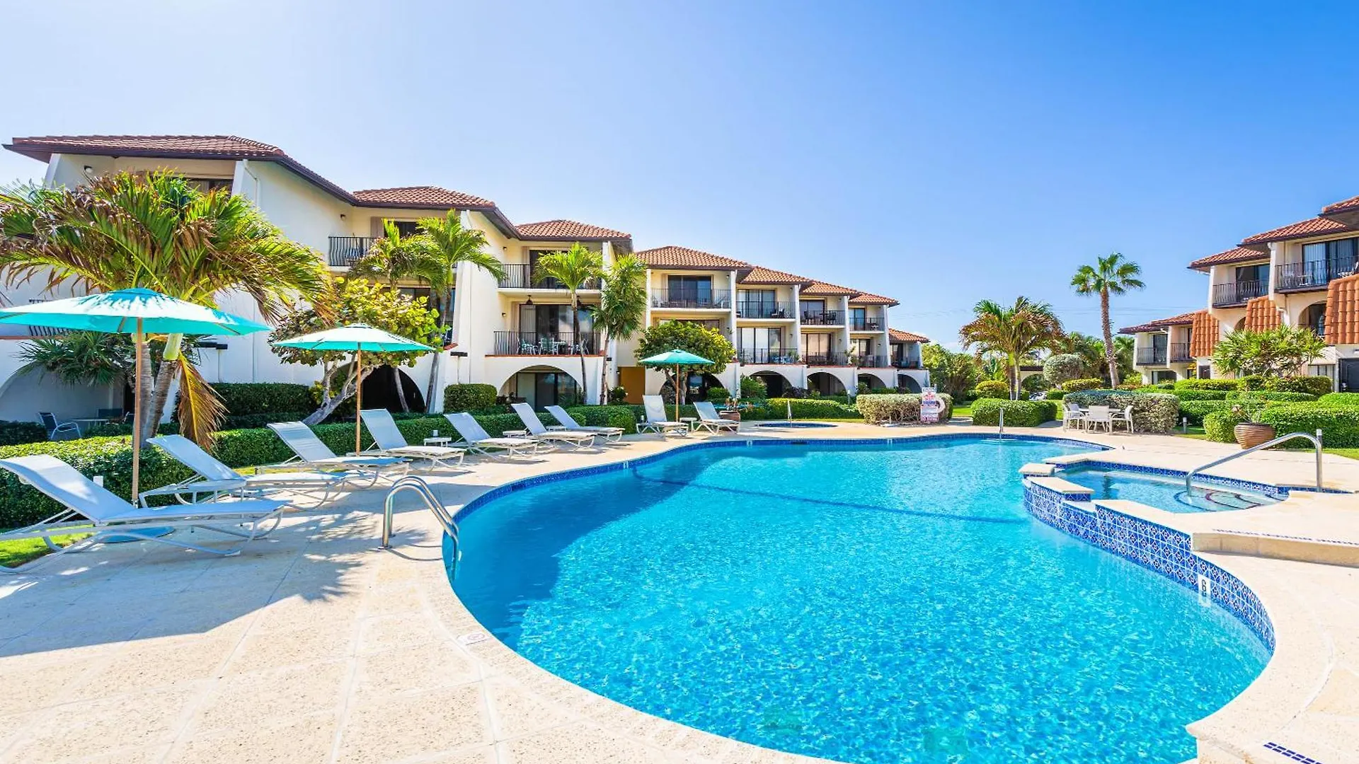 A sunny patio invites you to enjoy the sea view. Beach Living At Sunrise To Sunset Villa apartment also includes an outdoor pool area.